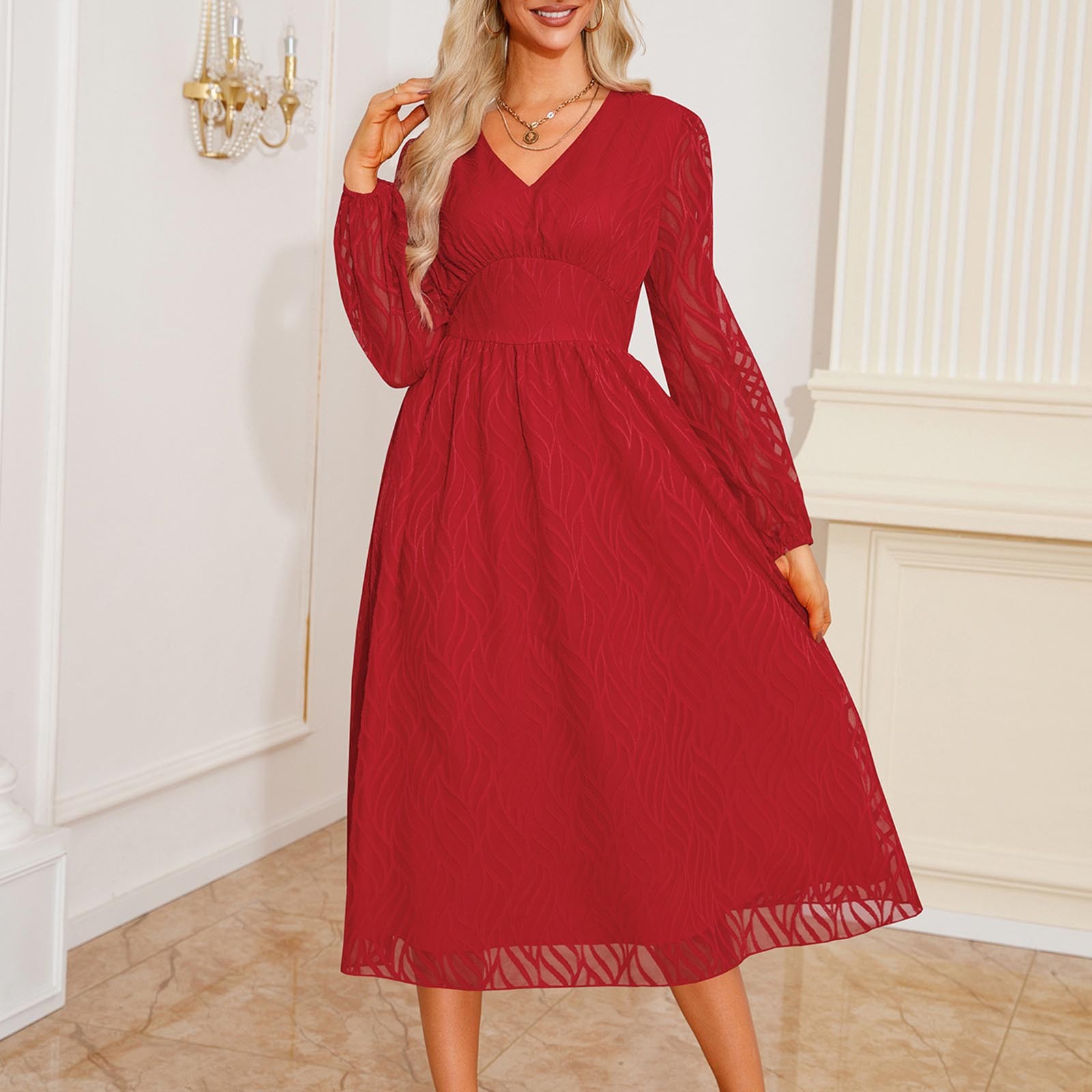 - SMihono Deals Maxi Dresses for Women Long Sleeve V Neck Empire Waist Layered Pleated Dress Elegant Flowy Ruffled A-line Long Dresses Red 4