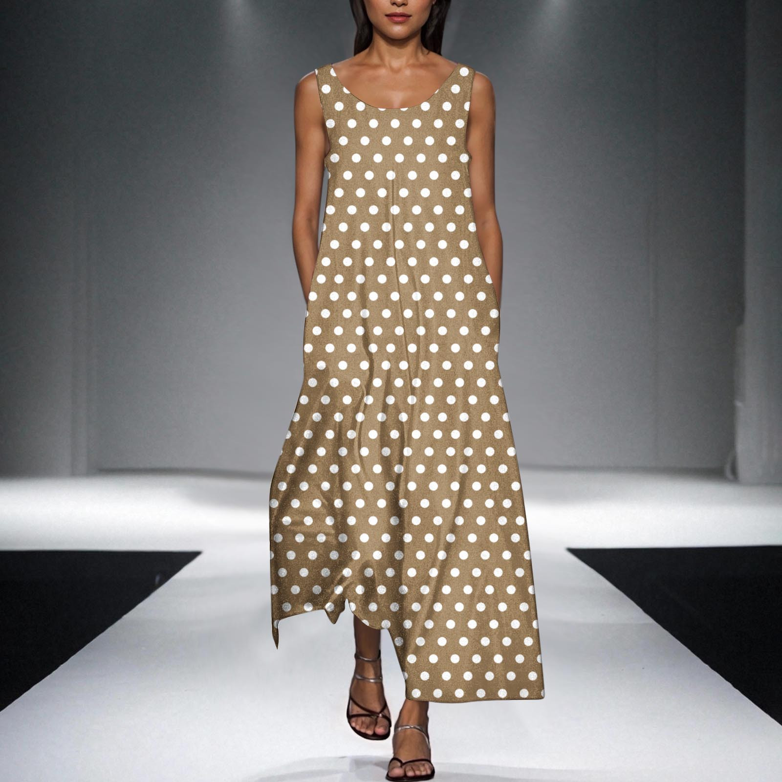SMihono Fashion Women's Ploka Dots Flowy Maxi Dress with Pockets, Elegant 2025 Summer Loose Crew Neck Sleeveless A-Line Swing Dresses Khaki M