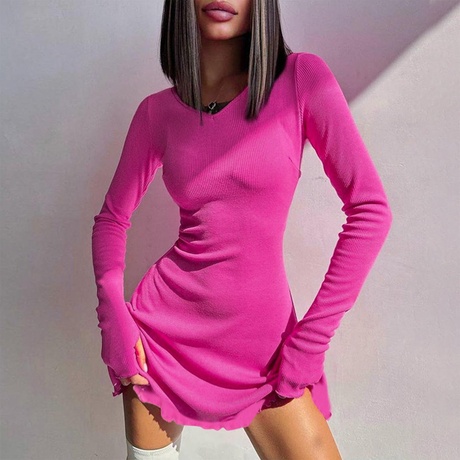 - SMihono Deals Womens Spring Long Sleeve Bodycon Dress Ribbed Knit Slim Pullover Stylsih Mini Sweater Dresses Going Out Clothes Hot Pink 6