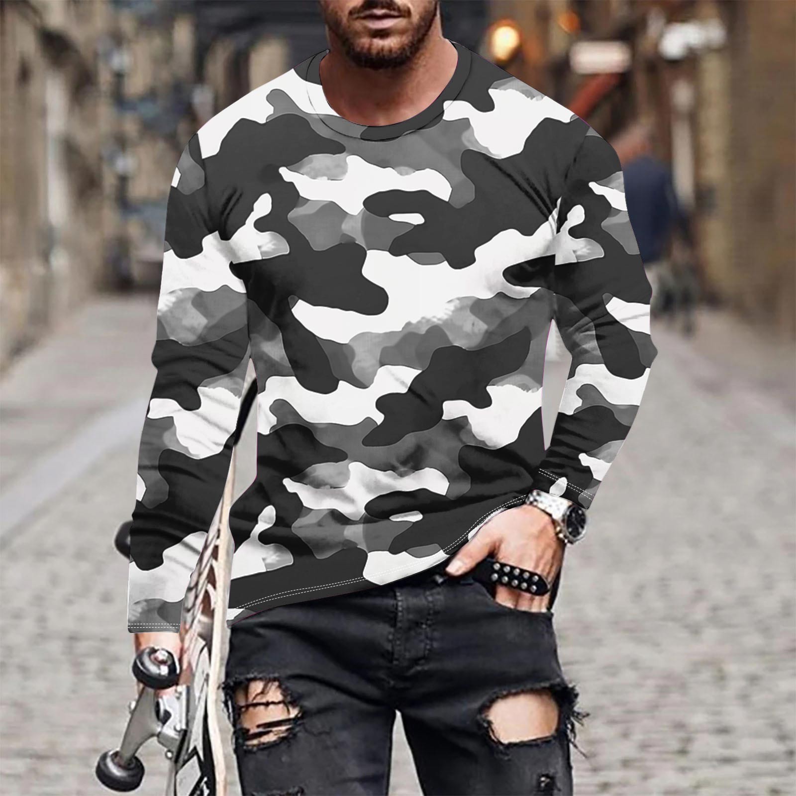 SSAAVKUY Mens Tshirts Graphic Vintage Camouflage Print Long Sleeve Crewneck Pullover Tops Casual Stylish Workout Shirts Gray 12