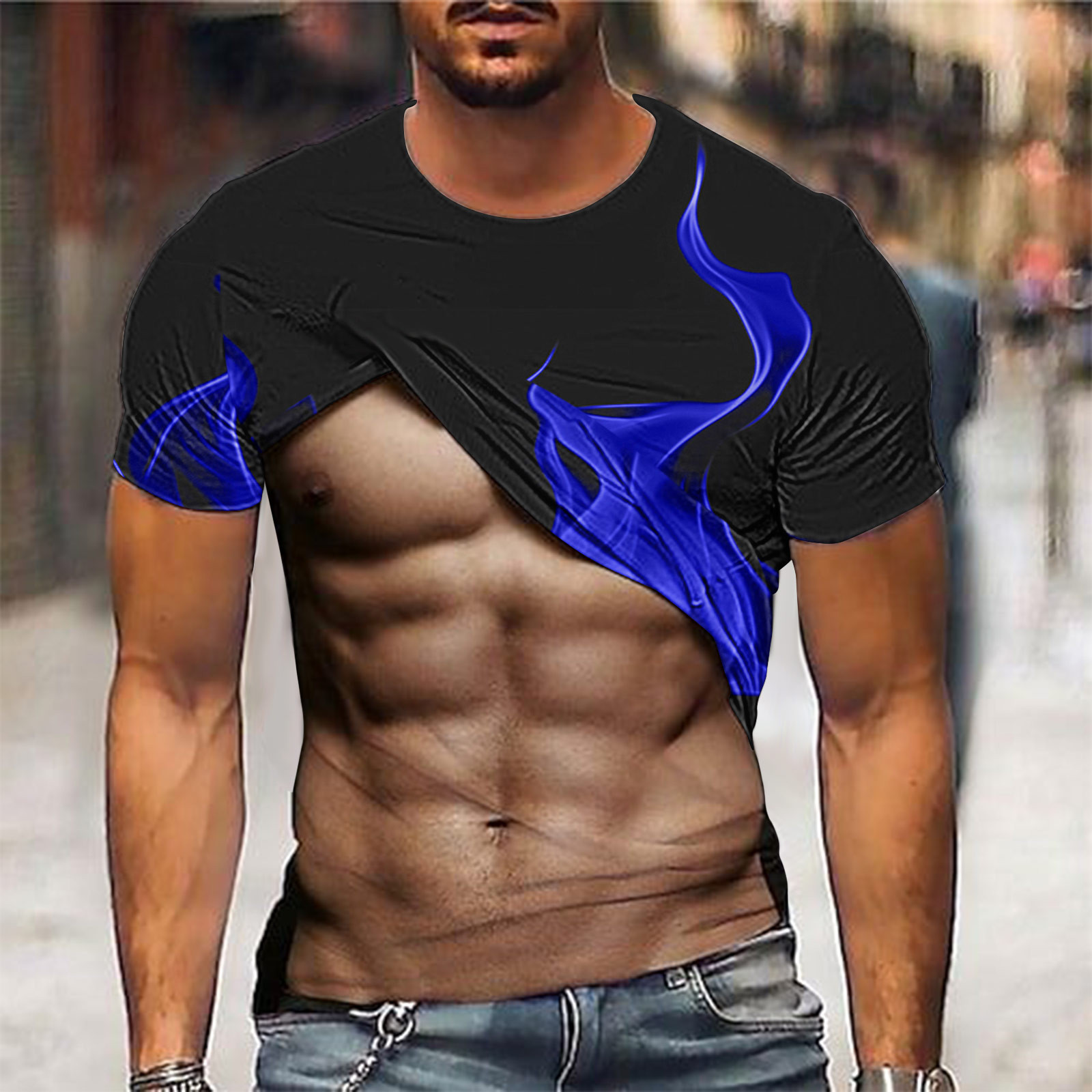 SSAAVKUY Muscle Tee Shirts for Mens Fake Abs T Shirt Funny 3D Flame Graphic Shirts Casual Summer Short Sleeve Tops Crewneck Tshirt Blue 12