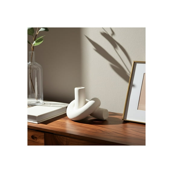 Elevate your interior with this modern candle holder crafted from high-quality stoneware in a crisp white finish that complements any setting. Measuring 6x5x4 inches, this thoughtfully designed piece functions as both a white taper holder and a stylish pillar base, offering multifunctional use. With its sculptural loop form and sleek matte texture, it brings a minimalist home accessory touch to living rooms, bedrooms, offices, and more. Whether you are styling a coffee table, bookshelf, or desk, this stoneware decor adds sophistication while blending effortlessly with boho, contemporary, or Scandinavian aesthetics. Made for durability and lasting appeal, it addresses the common need for high-style cohesive decor without overwhelming the space. Its sturdy structure and balanced design make it both a functional and eye-catching conversation piece. Upgrade your home or office with modern elegance and make your space feel intentionally curated, add this contemporary stoneware candle holder to your cart today.