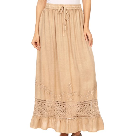 Sakkas Harley Bohemian Embroidered Ethnic Maxi Skirt Adjustable Waist Ruffle Trim - Beige - One Size Regular