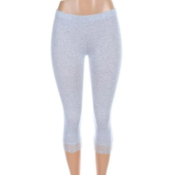 Description: The knit legging has elastic waistband, low rise cut and accented with lace trim along the hems. It comes in solid color and a mid-calf length. Good for both casual and active wear.