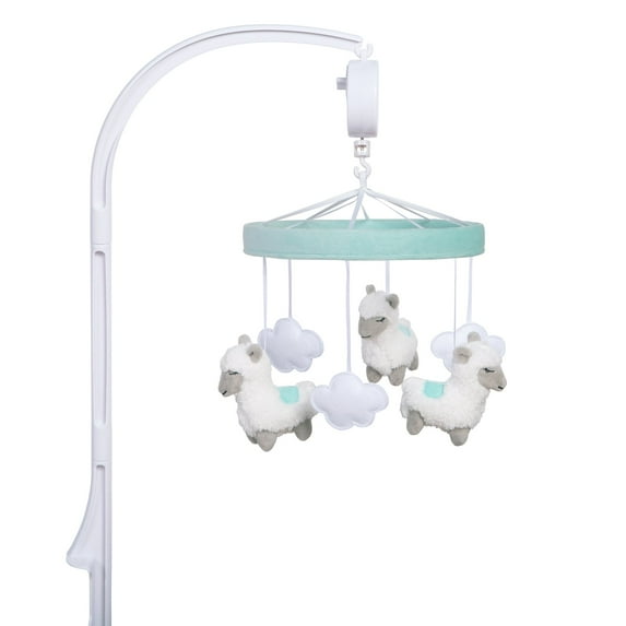 Encourage eye tracking and sound perception skills with this Unisex Llama Mama Musical Crib Mobile by Sammy & Lou. A light turquoise banded mobile ring features three smiling Llamas and three white fluffy clouds suspended from decorative white ribbons that slowly rotate to Brahms’ Lullaby. This mobile coordinates with the Sammy & Lou Llama Mama 4 Piece Bedding Set. Llama Mama Musical Crib Mobile-Solid Gray Ring; Stuffed Plush Llamas and Clouds; Teal, Gray, White; Assembled Dimensions 15 in x 24 in x 10 in.