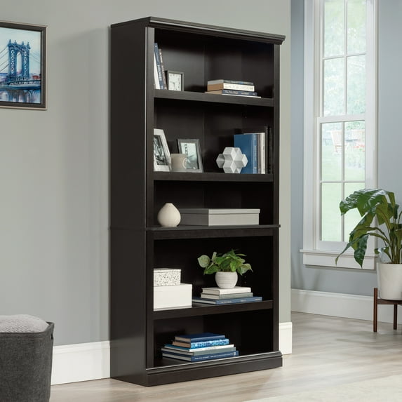 There is no such thing as too much storage space. Add a little extra storage to your home décor with this handsome 5-shelf bookcase form the Sauder Select collection. This tall bookcase features five spacious shelves for you to store and display anything from your collection of novels, work binders, and storage bins to decorative plants, your assortment of knick-knacks, and pictures of family and friends. Three of the shelves are adjustable so you can move them to the specific height and placement to fit all your needs. It has room to accommodate all your storage and display needs! This versatile bookcase adds simple style and elegance that is sure to stand out in any room of your home? Living room, dining room, office, or even the bedroom! Finished in a classy Estate Black, this good-looking 5-shelf bookcase gives your home the style you want with the functionality that you need.