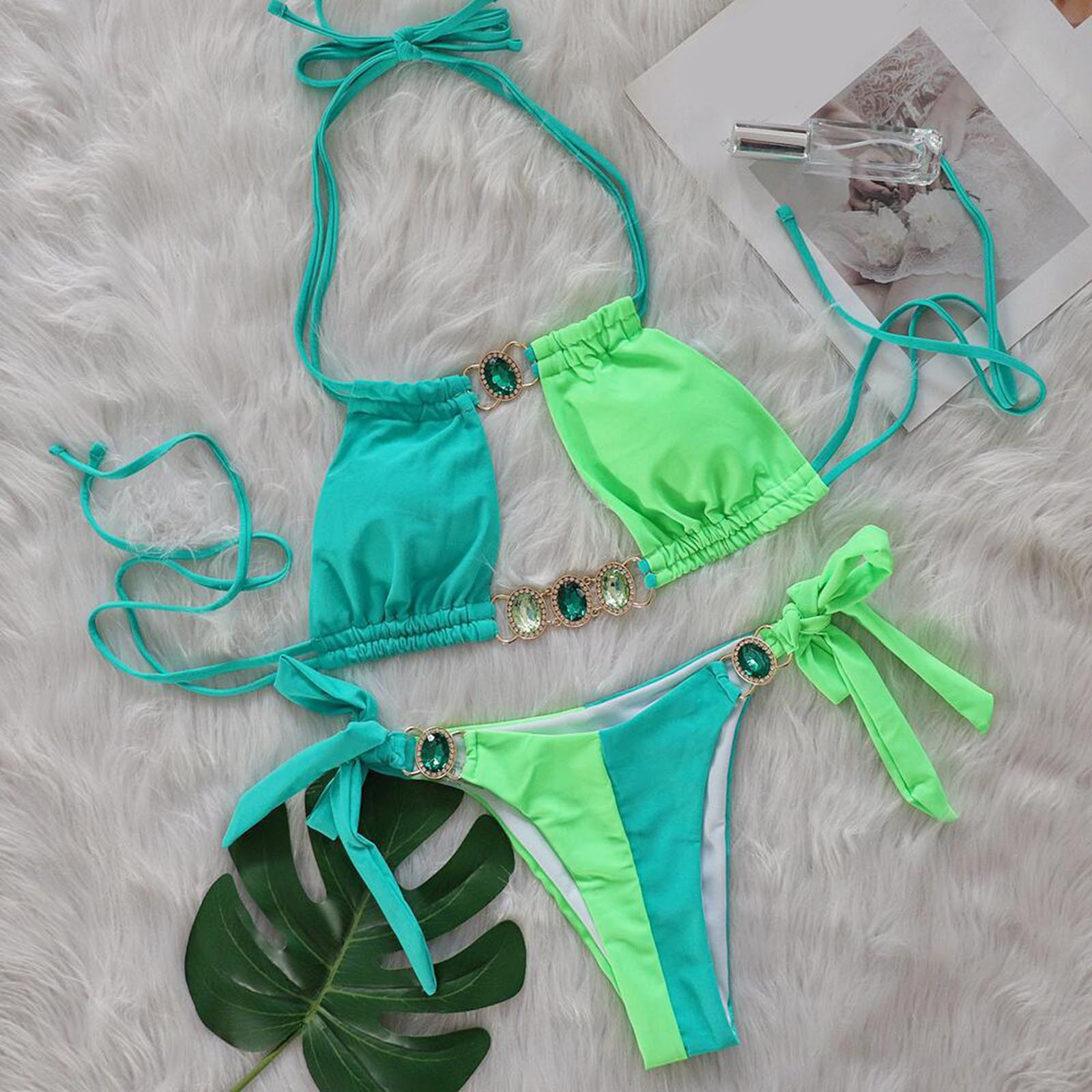 Hero image 0 of Saving UTSJKR Women's Lace-up Glitter Rhinestone Swimsuit Sparkly Jeweled Color Block Bathing Suit Halter Shiny Crystal Bikini Sets Green 4-6, 0 of 3