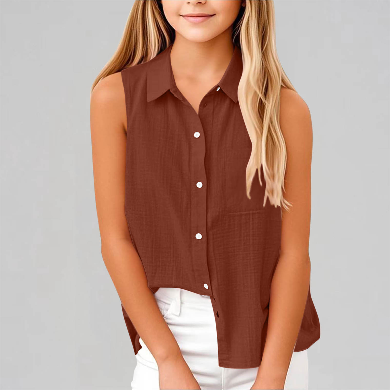 Hero image 0 of Savings Mwjwdo Girls Cotton Linen Shirt Sleeveless Button Up Lapel Collar Solid Color Tank Tops Fashion Casual Boho Vacation Tshirts Coffee 13 Years, 0 of 7