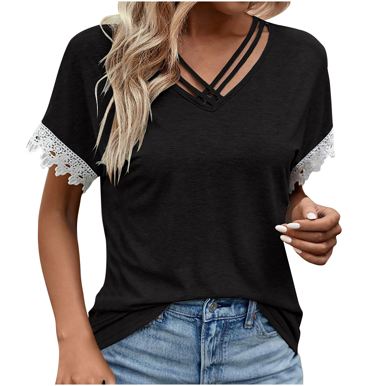 Fashion Olyvenn Criss Cross V Neck Tops for Women Lace Patchwork Short Sleeve Shirt Solid Color T Shirts Plus Size Loose Fit Blouse Black S