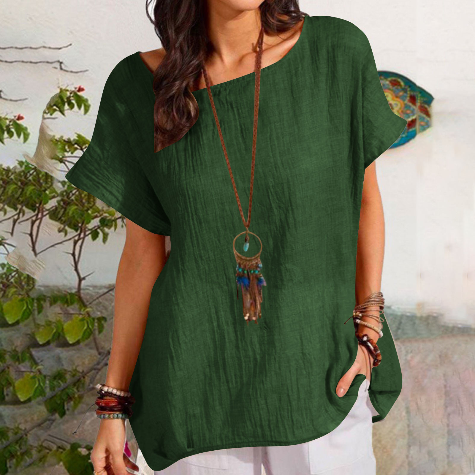 Fashion Olyvenn Linen Shirts for Women Plus Size Short Sleeve Casual Beach Top Crewneck Loose Fit Vintage Plain Summer Tshirt Blouses Army Green S