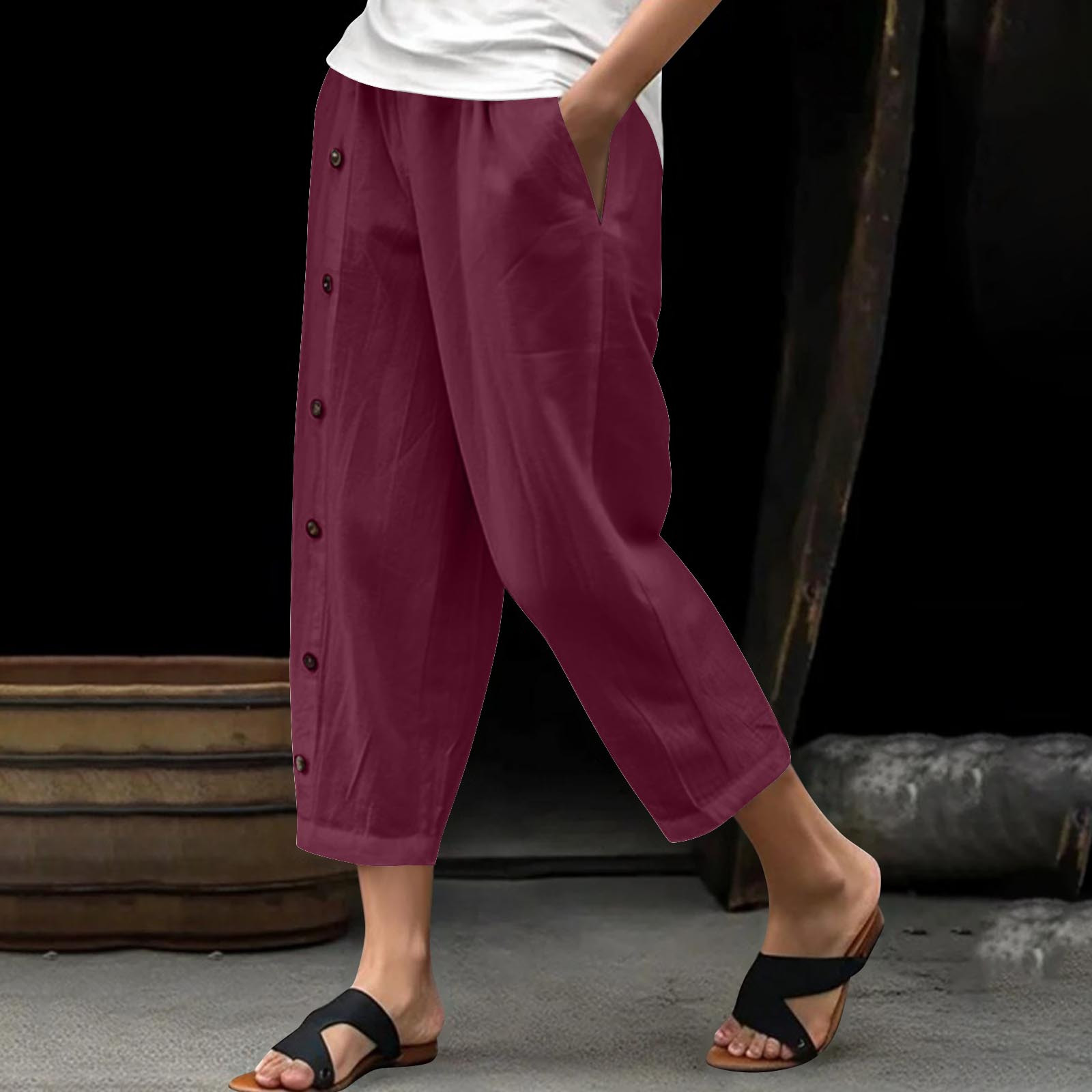 Fashion Olyvenn Women's Linen Capri Pants with Pockets Petite Summer Beachwear Lightweight Elastic Waist Boho Vacation Travel Pants Wine XXL
