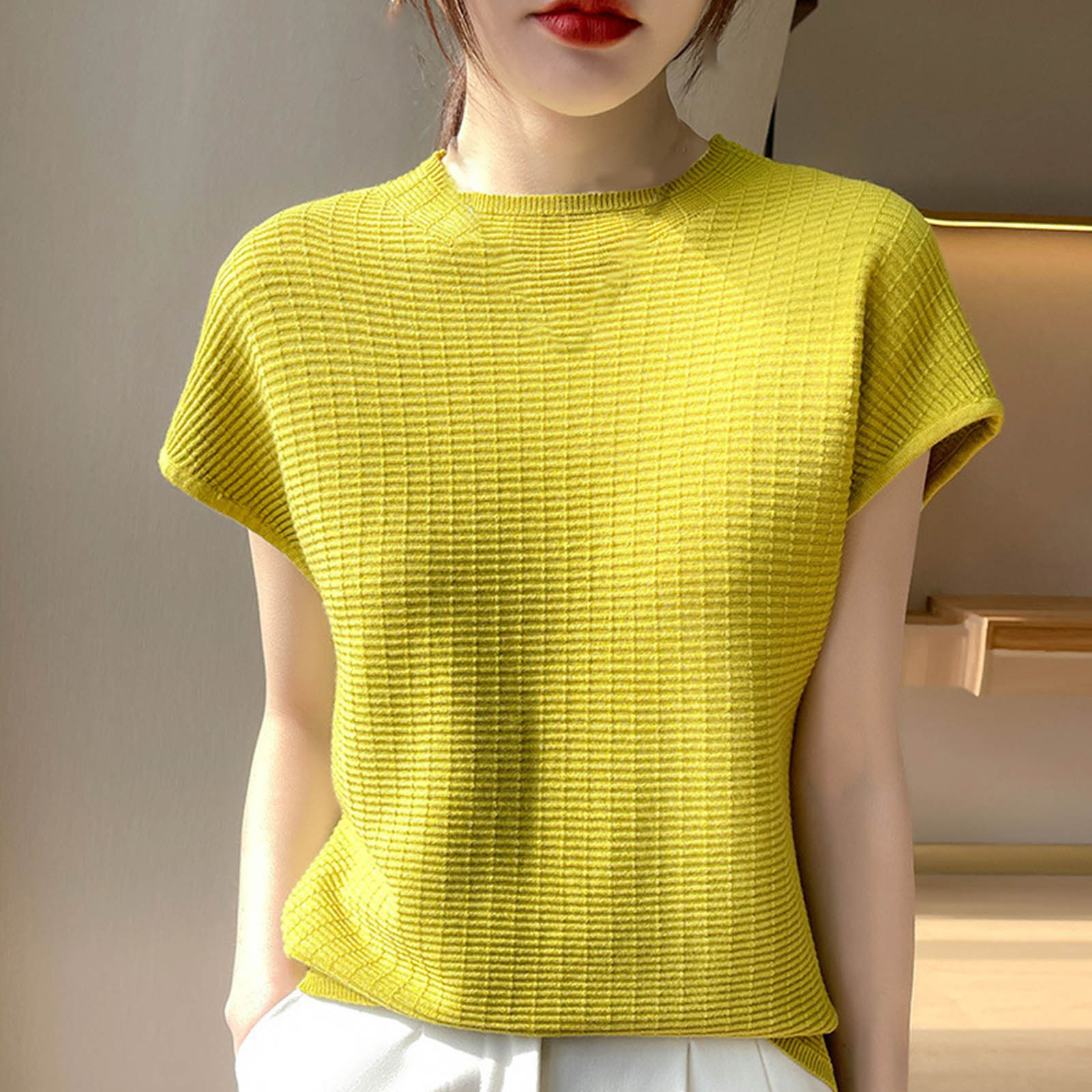 Fashion Olyvenn Womens Mock Neck Short Sleeve Rib Knit Summer Tops Dressy Blouse Tee Fitted Shirts Elegant Casual Going Out Blouse Yellow L