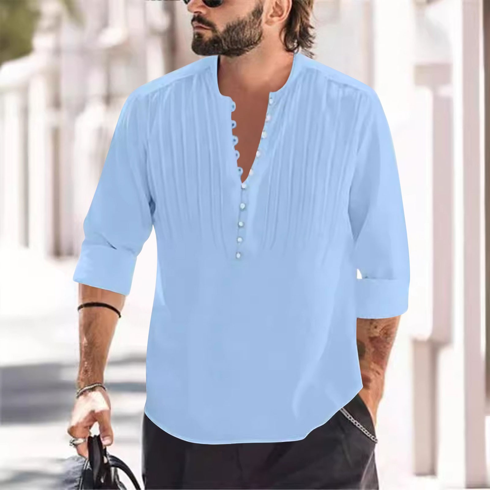 Savings YLSDY Casual Long Sleeve Loose Shirt for Men Round Neck Button Up Solid Dressy Tee Shirts Pleated Front Trendy Tops Blue L