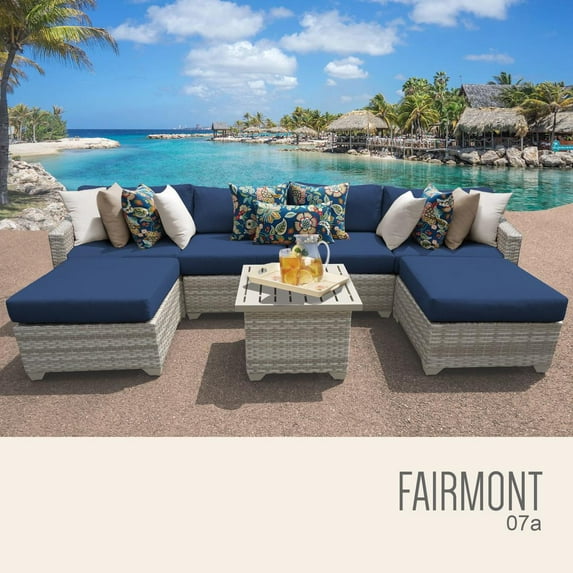 - Set Configuration: The FAIRMONT-07a-NAVY is a 7-piece outdoor wicker patio furniture set.