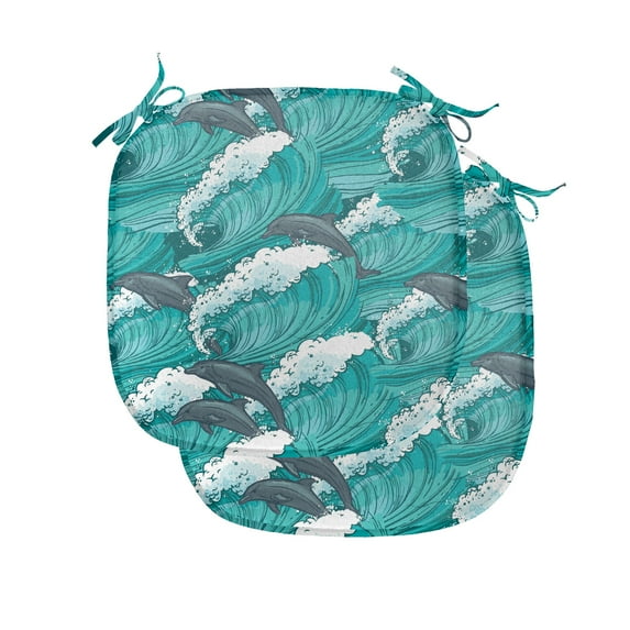 Hero image 0 of Sea Animals Chair Seating Cushion Set of 2, Wavy Ocean with Dolphins Windy Surfing Doodle Style Art Print, Seat Pads for Office with Anti-slip Backing, 16"x16", Charcoal Grey Teal White, by Ambesonne, 0 of 5