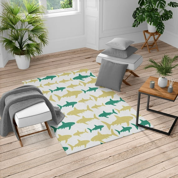 Hero image 0 of Sea Animals Turkish Area Rug, Monochrome Shark Illustration Fashion Maritime Illustration Aquatics, Soft Carpet for Living Room Decor with Distressed Look, 4' X 5.7', Sea Green, by Ambesonne, 0 of 4