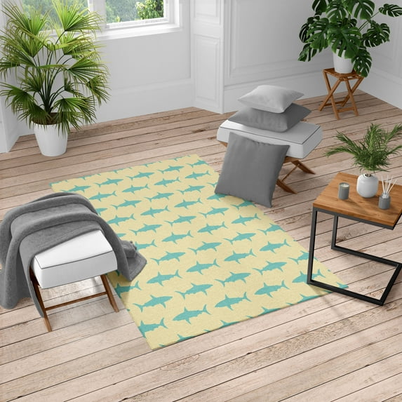 Hero image 0 of Sea Animals Turkish Area Rug, Sharks Swimming Horizontal Silhouettes Powerful Dangerous Wild Life, Soft Carpet for Living Room Decor, 4' X 5.7', Pale Peach Sea Blue, by Ambesonne, 0 of 4