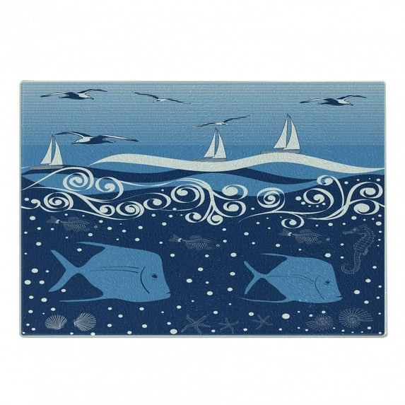 Hero image 0 of Seagulls Cutting Board, Underwater Illustration Tropical Fish Sailboats Curling Waves Birds and Sea Life, Decorative Tempered Glass Cutting and Serving Board, Small Size, Blue White, by Ambesonne, 0 of 1