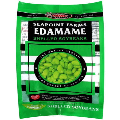 Edamame, Shelled Soybeans 16 oz (454 g) 0 g trans fat. Low fat. Steams in minutes. The wonder veggie. Good source of protein. Heart Healthy: 25 grams of soy protein a day, as part of a diet low in saturated fat and cholesterol, may reduce the risk of heart disease. A serving of Seapoint Farms Edamame provides 8 grams of protein. Low sodium. Cholesterol free. Edamame (ed-ah-mah-may) is a complete protein containing all the essential amino acids. Seapoint Farms Edamame is a good source of protein, fiber, essential fatty acids, and isoflavones (found only in soy). One serving of Seapoint Farms Edamame provides 35 mg of isoflavones. Non GMO. Product of China. Keep frozen. Edamame may be served hot or cold. Quick & Easy Ways to Serve Seapoint Farms Edamame: appetizers; salads; casseroles; snacks; stir-fry; soups. Microwave: Do not open, pierce or thaw bag before cooking. Gently shake bag side to side to distribute contents evenly. Place frozen, unopened bag this side up in microwave. Microwave on High for 3-1/2 to 4-1/2 minutes (microwave ovens vary in cooking times). Let product stand for 1 minute then carefully remove bag from microwave; it will be hot. Tear open bag, pour into serving dish, season to taste and enjoy! Stove Top: Bring 6 cups of water to a boil in a large saucepan. Add the contents of this package (1 lb) frozen Seapoint Farms Edamame and 1/2 tsp salt (optional). Return to a boil for 4 to 5 minutes. Drain and rinse with cold running water to cool. Season to taste. 16 oz (454 g) Huntington Beach, CA 92648