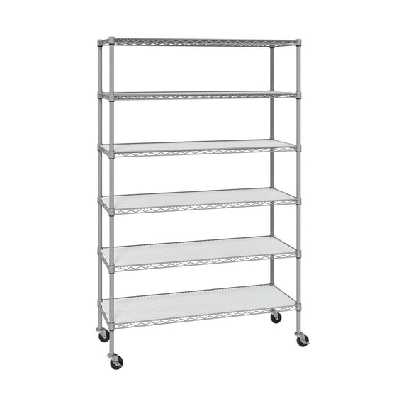 - Adjustable Shelving: Six steel wire shelves, each 48" W x 18" D, are height adjustable in 1-inch increments and come with fitted frosted white polypropylene liners.