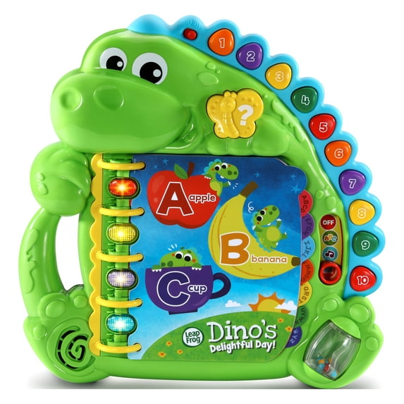 Learning the ABCs is a great way to spend the day! Read about Dino's day while learning the alphabet in the Dino's Delightful Day Book. Letters and words are woven into the story in alphabetical order with phonetic sounds to introduce ABCs to your little one through a charming tale. Toddlers can flip through the 16 interactive pages to hear the story read aloud, or enjoy musical play by jamming to a melody with fun sounds and musical notes. Press the light-up button to hear letter names, letter sounds and words from the story. Number buttons along the dinosaurs back introduce counting and recognizing numbers from one to ten. This complete childrens book with a beginning, middle and end exposes your child to early reading skills. Its a great day, from A to Z! Intended for ages 12+ months. Requires 2 AA batteries. Batteries included for demo purposes only. New batteries recommended for regular use.