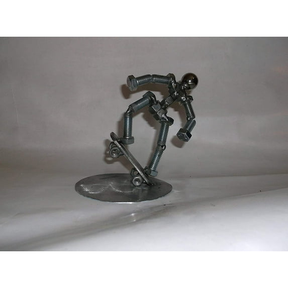 Kick Flip man! This metal Skate boarder figure is handcrafted using recycled bolts, nuts, bearings, and other metal materials. The figure makes an excellent gift, especially for individuals interested in skate boarding. It would look great displayed on a tabletop, a bookshelf, on a desk, in a window, in your work-out area, or as a paperweight, etc. Makes a great little gift, or buy several and keep one for yourself. All items are handcrafted using recycled materials so each item has its own unique characteristics. SIZE: 5"height x 3"length x 3"width Dimensions are approximate and may differ slightly. HANDMADE IN THE USA When looking at the prices of these items please take into consideration that they include the cost of materials, time and labor, as well as the process of designing the items, and the tender loving care it took to create them...just for you! :-)