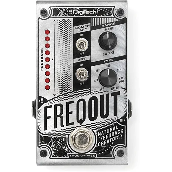 The DigiTech FreqOut natural feedback creator allows you to get sweet, natural feedback at any volume, with or without distortion. The FreqOut is perfect for situations where volume must be controlled like in the studio, with in-ear monitors, or low-volume performance and practice. However, the FreqOut can also be used at gig volume to focus out-of-control feedback on a preferred harmonic at any stage position. The FreqOut has adjustable feedback Onset delay before feedback begins, gain feedback level to balance with your dry signal, dry On/Off, latching or momentary operation, true bypass, and a rugged road-tough steel chassis. The FreqOut uses a 9VDC power supply to easily integrate into your existing pedalboard.