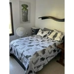 Cute cat pattern >"< !! Wish it came in bigger sizes and different colors :/ . I purchased the full/queen size, my bed is a queen so quilt comes up a little short on the sides BUT acceptable :) Not a fan of microfiber material in general or the color white BUT HAD TO HAVE THIS :D Material is lightweight and cool, a MUST HAVE for any crazy cat person.