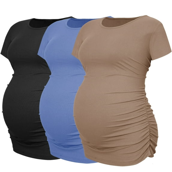 Women's Maternity Shirts Tops Side Ruched Ribbed Pregnancy Clothes 3-Pack