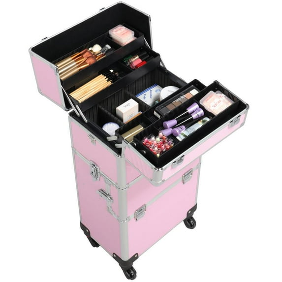 Alden Design Professional Makeup Case, 3 in 1 Portable Trolley, Pink