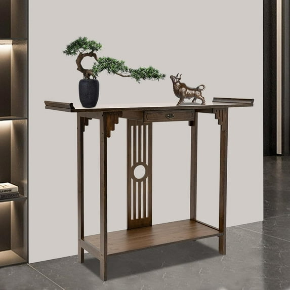 Made of bamboo, this sofa table is a piece of high-quality home furniture for the living room, dining room, and other places. The walnut color tone, bamboo texture, and warped head design make it look very elegant and classical. The spacious top platform, bottom partition, and small drawer make it convenient for you to store your items and make the whole space more neat and organized. Overall, it is not only beautiful and practical, but also of high quality, worth your purchasing.