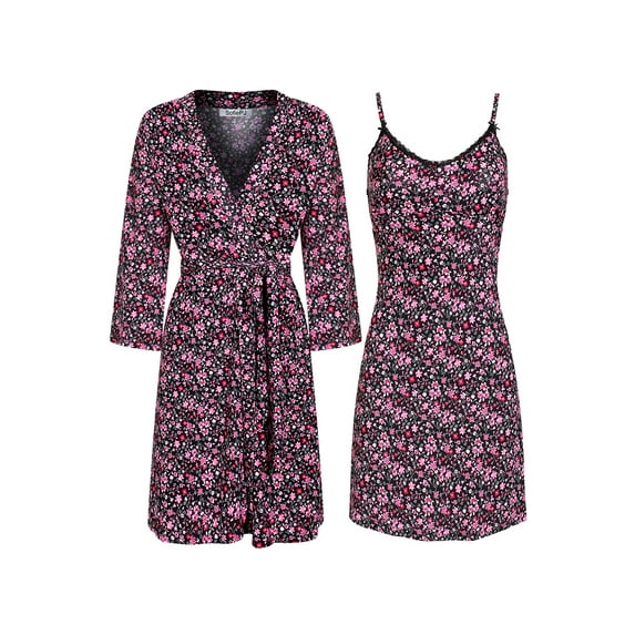 SofiePJ, Women's, Plus Size Printed Robe Set with Chemise 2 Piece Sleep Lounge Set, Black Pink, 2X