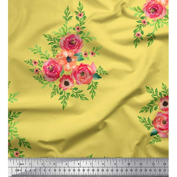 Soimoi Yellow Heavy Satin Fabric Flower Floral Decor Fabric Printed 1 Yard 56 Inch Wide