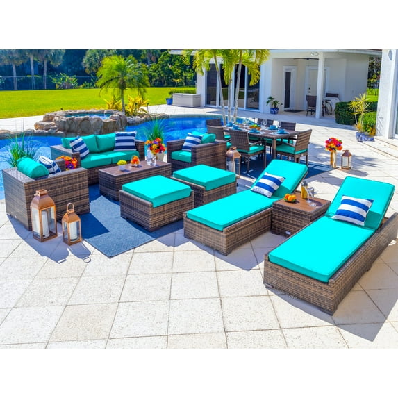 Shipping, arrives in 3+ daysTuscany 21-Piece Resin Wicker Outdoor Patio Furniture Combination Set with Sectional Set, Eight-seat Dining Set, and Chaise Lounge Set (Half-Round Brown Wicker, Sunbrella Canvas Aruba) $4,466.00
