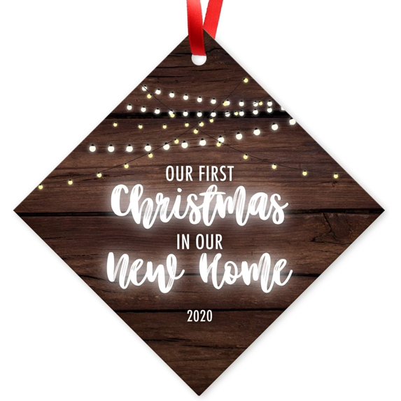 Soul Décor Our First Christmas in Our New Home 2020, Christmas Tree Decorations Gift Ornaments, Large 3.75" Diamond Metal Ornament, Velvet Pouch Included