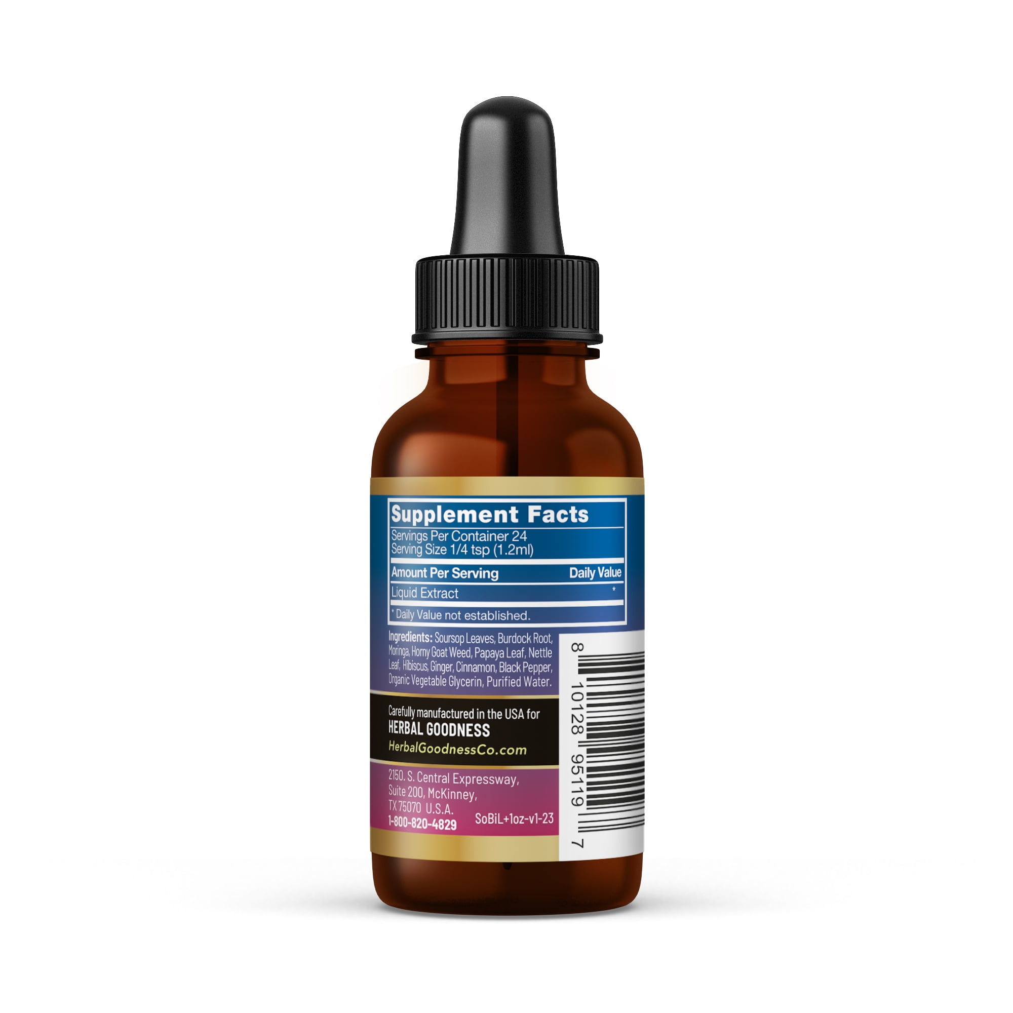 Experience the natural goodness of Herbal Goodness Soursop (Graviola) Bitters Liquid Extract, a premium herbal blend carefully formulated with organic Guanabana (Soursop) leaf and a unique combination of botanicals. This liquid extract is designed to complement a balanced lifestyle, offering a natural way to support your daily wellness routine. Crafted with Soursop leaves, Burdock root, Moringa, Horny Goat Weed, Papaya leaf, Nettle leaf, Hibiscus, Ginger, Cinnamon, and Black Pepper, this supplement provides a blend of traditional botanicals that have been valued for their unique properties. Each ingredient is thoughtfully selected to deliver a high-quality herbal extract. The liquid form allows for easy use—simply add it to water, tea, or smoothies to incorporate the benefits of these botanicals into your routine. Whether you are looking for a natural herbal addition to your diet or a supplement to complement your wellness goals, this Soursop Bitters Liquid Extract is an excellent choice. At Herbal Goodness, we prioritize quality and purity. This supplement is non-GMO, free from artificial additives, and made with organic vegetable glycerine and purified water. With a focus on sustainability and high-quality sourcing, our herbal extracts provide a natural way to enhance your wellness journey.