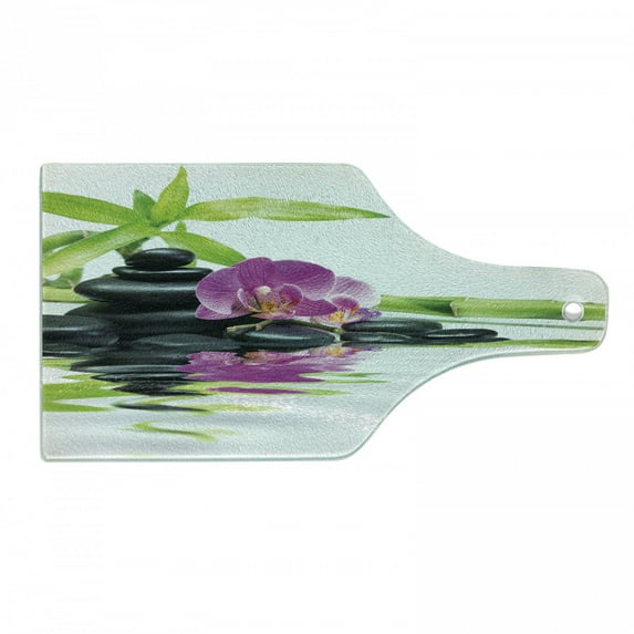 Spa Cutting Board, Relaxation Ways Massage Stone Orchid and Bamboo Print, Decorative Tempered Glass Cutting and Serving Board, Wine Bottle Shape, Purple Black, by AmbesonneSpa Cutting Board Relaxation Ways Massage Stone Orchid Bamboo Print Decorative Tempered Glass Serving Wine Bottle Shape Purple Black AmbesonneSpa Cutting Board Relaxation Ways Massage Stone Orchid Bamboo Print Decorative Tempered Glass Serving Small Size Purple Black AmbesonneSpa Cutting Board Relaxation Ways Massage Stone Orchid Bamboo Print Decorative Tempered Glass Serving Large Size Purple Black Ambesonne