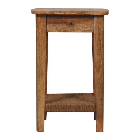 rope end table is a true masterpiece of craftsmanship. made from 100% solid wood, it boasts an oak-ish finish that gives it a classic and timeless appeal. brown wood tone creates a cozy and inviting atmosphere in any room. table's square shape and mango wood type add a modern touch, making it a versatile piece that can blend seamlessly with various interior styles. with a depth of 16.05 inches, a width of 16.05 inches, and a height of 23.57 inches, it is perfectly proportioned to fit into any primary living space. 17.67-pound weight ensures that table is and reliable. small drawer is a convenient feature for keeping your essentials neatly organized, while rope-woven-style shelf offers additional storage for your belongings. this end table is not just a piece of furniture; it is a statement of style and functionality. whether used as a bedside table or a living room accent, it is sure to make a lasting impression. : rope end table, solid wood, oak-ish finish, brown wood tone, square, mango wood, small drawer, rope-woven shelf, storage, primary living area, , functional, style statement