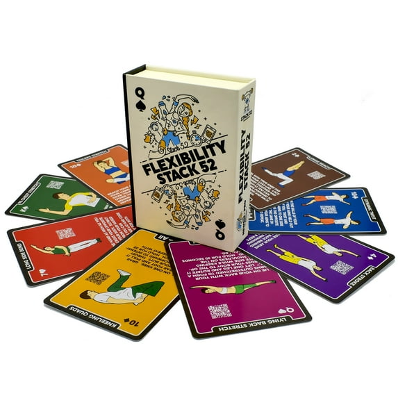 Stack 52 Flexibility Exercise Cards. Learn Static and Dynamic Stretches. Video Instructions Included. Perfect for Workout Warm Ups and Cooling Down. Increase Joint Range of Motion. You want to improve your flexibility, but you don’t know how. You know you should warm-up and cool down before exercising, but you usually skip it because you’re tired of doing the same boring stretches. We designed Flexibility Stack 52 for you. We put 52 of the most effective dynamic and static stretching exercises on playing cards. Deal yourself a stretching routine to improve your flexibility or choose a few cards as a warm up before your workout and a few cards to cool down after your workout. About Stack 52 and founder, Sergeant Volkin Our mission is to make fitness fun and accessible for everyone. Sergeant Volkin has a master's degree in science, has authored 5 books, and has over 20 years of fitness experience. The US Army awarded Sergeant Volkin a medal for the fitness programs he designed for the troops. Stack 52 exercise games have been sold in over 24 countries. What's in the Box: Flexibility Stack 52 contains 54 cards. There are 8 different colors with each color representing the targeted muscle group being stretched: · 18 Leg stretches (yellow) · 2 Arm stretches (orange) · 4 Chest stretches (green) · 5 Shoulder stretches (purple) · 3 Back stretches (pink) · 4 Abdominal/Core stretches (red) · 12 Dynamic Warm Up Exercises (blue) · 5 Full body compound stretches (brown) · 2 Instructional Cards Recommended Equipment (Not Included): A large yoga mat Features : - NEW FOR 2019: We kept everything our customers love about Flexibility Stack 52 and improved it based on their feedback. The cards are 50% larger. The font is larger and easier to read. The illustrations are larger. The new design is beautiful and fun. - CONTAINS: 52 of the most effective dynamic and static stretching exercises on large suited and numbered playing cards. Perfect for pre-workout warm up and post-workout cool down. No additional equipment is needed. - IMPROVE FLEXIBLITY SAFELY: No planning or preparation. Shuffle the deck and deal yourself a stretching routine or play a Flexibility Stack 52 card game. Visit our website for free game ideas or modify your favorite card game into a stretching program! - EASIEST WAY TO LEARN STRETCHING EXERCISES: Each card has a diagram and description that explains how to perform the stretch. Scan the QR code with a smartphone or tablet to watch a quick video demonstration of the stretch. - FUN & MOTIVATING: Games and competition make stretching fun! Play by yourself or compete with your friends! No more boredom. There are 52 different stretches and endless game possibilities. - - - 4 Ounces