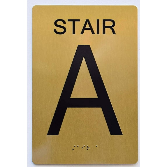 ADA STAIR A SIGN GOLD. This is a HIGH QUALITY Aluminium sign!!! This is not acrylic sign (Plastic sign).This is a Braille sign with RAISED tactile Graphics and Letters. Sign is shipped ready-to-install with double sided tape.A picture is worth a thousand words- see our images Notice: Color of the SIGN can be look different base on the lighting around it (Darker GOLD or light GOLD base on light surrounding it)STAIRs SIGN- GOLD.SIZE: 6X9 InchColor letter: BLACKColor background: GOLD