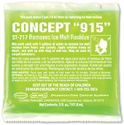 Concept 915 removes ice-melt residue from carpets and floors. Powerful chelating agents chemically suspend the salt and chloride residues in the mop solution or carpet extractor so that they do not redeposit in an unsightly white crust or film. Pleasant sassafras fragrance. The pH-neutral chemistry of Concept "915" protects the gloss of fine floor finishes. Concept "915" saves labor by eliminating excessive floor rinsing. When diluted, each packet makes 5 gallons of cleaning solution. Can be used in a mop bucket or carpet cleaning extraction machine.
