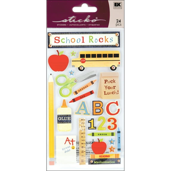Stickers add the perfect finishing touch to your paper projects. Stickers can be a fun embellishment, a whimsical accent or add elegant polish to scrapbook pages, greeting cards, mixed media and more. This package contains Sticko Stickers- School Rocks, 24 stickers. Imported.