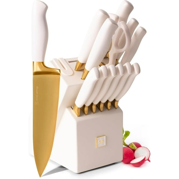 Styled Settings Gold and White Knife Set with Block, 14-Piece Self-Sharpening Titanium-Coated Stainless Steel KnivesWhite Gold Knife Set Block Self Sharpening 14 PC Titanium Coated Gold White Kitchen Knife Set White Knife Block Sharpener White Gold Kitchen AccessorBlack Gold Knife Set Sharpener 14 PC Gold Knife Set Block Sharpener Includes Full Tang Black Gold Knives Self Sharpening Knife Block Set Black Gold KStyled Settings Stainless Steel Knife Set Built Sharpener 14 Piece Ultra Sharp High Carbon Stainless Steel Kitchen Knife Set Includes White Knife BloStyled Settings Copper Knife Set with Sharpening BlockStyled Settings Gold Kitchen Knives Cutlery Set Black and Gold 14 PieceStyled Settings White Stainless Steel Knife Set with Walnut Block with SharpenerStyled Settings White Knife Set Block Sharpener 14 Piece Ultra Sharp High Carbon Stainless Steel Knife Set Gold Triple Riveted Forged White Handle AsStyled Settings White Knife Set Block Sharpener 14 Piece Ultra Sharp High Carbon Stainless Steel Knife Set Includes Ashwood Knife Block Sharpener BuiGold Knife Set Kitchen Block Sharpener 14 Piece Razor Sharp Titanium Gold Kitchen Knife Set Ashwood Knife Block Sharpener Built Gold Kitchen Accessor