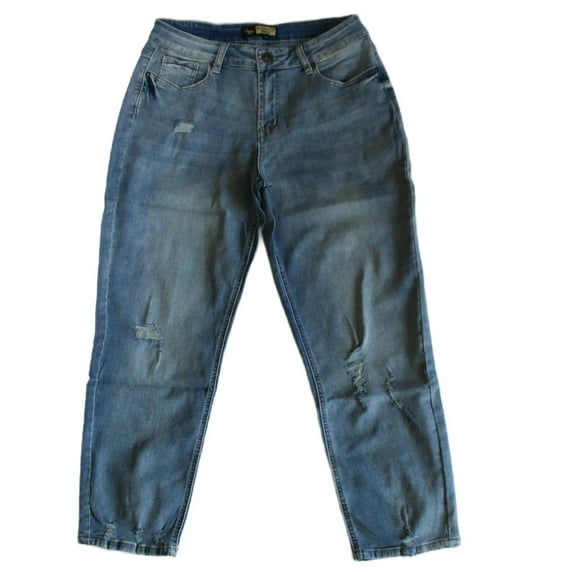 These Suzanne Betro pants are very comfortable. They are a medium wash, distressed, mid-rise, crop boyfriend jean. Have a 5 pocket design with a button/zipper closure. Offering in a junior womans' size 10. Officially licensed. Machine Washable. Imported. Please be aware there are many variances in color shades and color variate. These colors can also be affected by screen display settings.