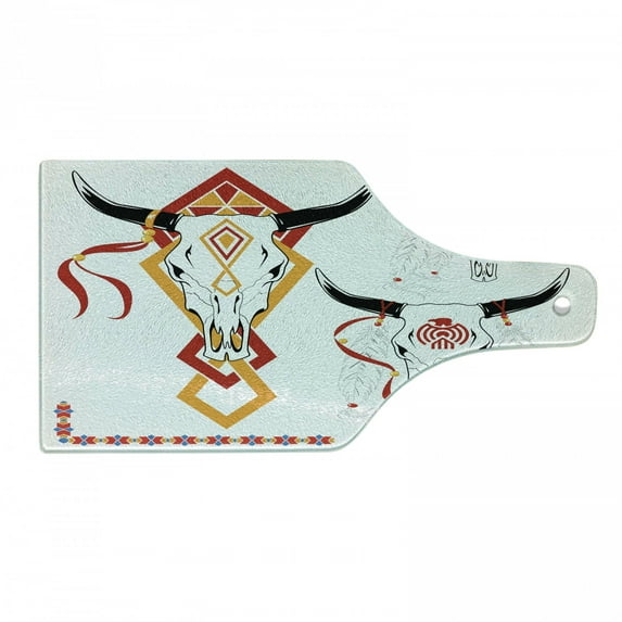 Hero image 0 of Tattoo Cutting Board, Bulls Head with Feather of Bird as Accessory with Tribal Designers Print, Tempered Glass Cutting and Serving Board, Wine Bottle Shape, Red Yellow and White, by Ambesonne, 0 of 1