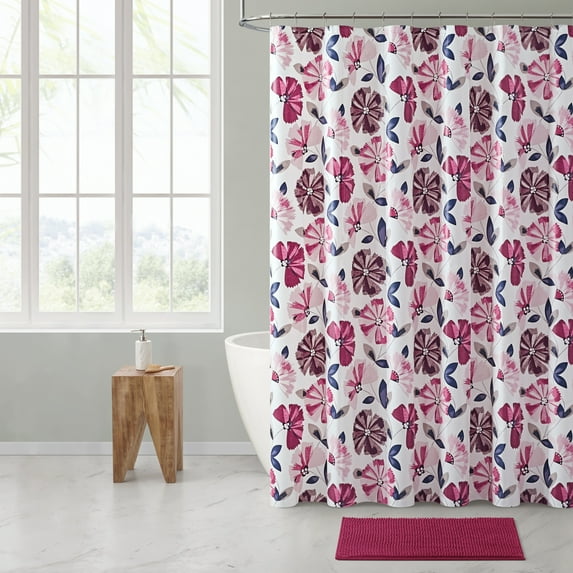 Add a bold pop of pattern to your bathroom decor with the VCNY Home 14-Piece Tayson Floral PEVA Shower Curtain Set, which features eye-catching floral prints on a white background. The waterproof shower curtain is made with PEVA materials that are durable, water-repellent, chloride-free, and built to last. This 14-piece bath set includes a PEVA shower curtain, shower hooks, and a noodle bath rug to complete the look. You can keep the shower liner clean and looking like new by wiping it clean with a damp cloth as needed. The bath rug is machine washable for quick and easy care.