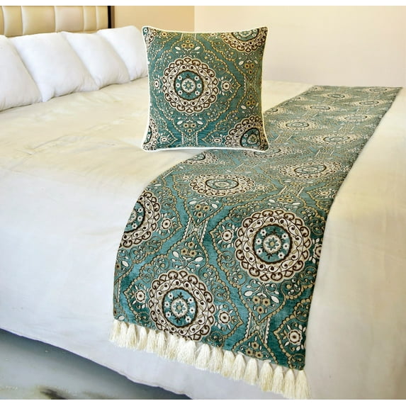 The HomeCentric King / Queen / Twin Teal Decorative Full 68"x18" Bed Runner WITHOUT Pillow Cover, Art Deco, Floral, Tassels & Velvet Bed Scarf on Velvet fabric - Ahmet