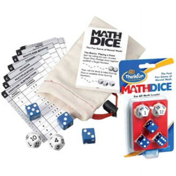 Introducing the most flexible, competitive math game ever invented; MathDice is guaranteed to draw a crowd! Play is easy - roll the dice to generate a Target Number and three Scoring Numbers. Arrange the Scoring Numbers into combinations of operations, such as addition, subtraction, or even powers, to create an equation whose result is closest to or equal to the Target Number. For 1 single player, ages 8 and up.Contents: 2 target dice, 3 scoring dice and lesson booklet.