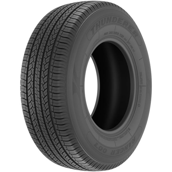 The Thunderer Ranger R007 HT is an all-season tire designed for light trucks and SUVs. It features a 5-rib tread with angled and circumferential grooves to divert water from the contact patch and prevent hydroplaning. Additionally, it has angled grooves and sipes for improved wet and winter traction, a closed shoulder for better cornering and stability, and a long-lasting rubber compound. Plus, the Thunderer Ranger R007 HT comes with a 60,000 mile limited manufacturer tread life warranty.
