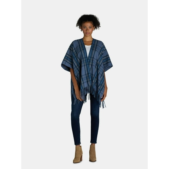 Time and Tru Women's Plaid Fashion Ruana, One Size, Blue